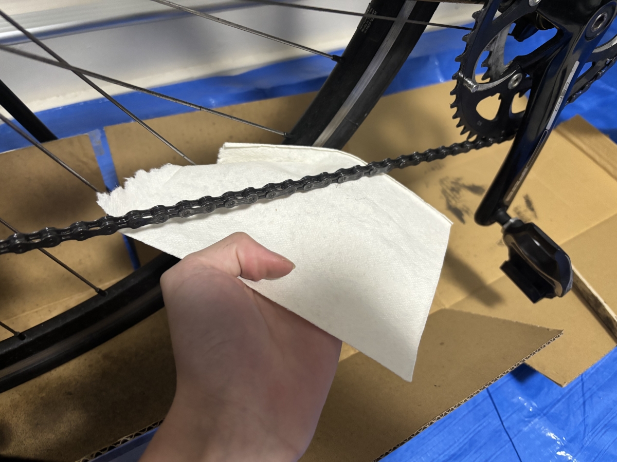 ここでもう一度付属のウエスで拭きあげます。チェーンの汚れが落ちきっている状態なので、ここはしっかり丁寧に拭きあげてあげると◎です!