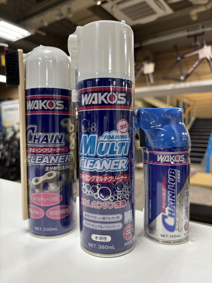 冬はどうしてもライドの頻度が落ちがちなライダーの方が多いのではないでしょうか。室内トレーナーでライドもできますし、今回のブログのように乗らなくても自転車に触って楽しむこともできます!WAKO’S 3点セット、めちゃめちゃおすすめです!なお、チェーンディグリーザー、フォーミングマルチクリーナー、チェーンルブはバラ売りもありますのでこの冬はぜひ愛車のメンテナンスをしてあげてください!ご来店お待ちしております。