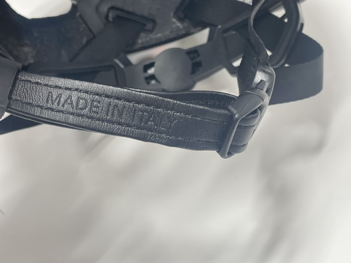 PROTONE ICONの顎紐は合成皮革のなっています。ナイロン製と異なり汗が染み込まず清潔で防臭の効果も期待できます。