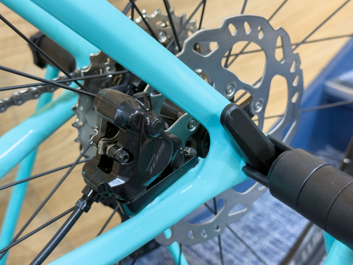 ディスクブレーキシステムなので、天候に左右される事なくしっかりブレーキが効きますので通勤やレースにでもしっかり使い込んでいけますね!