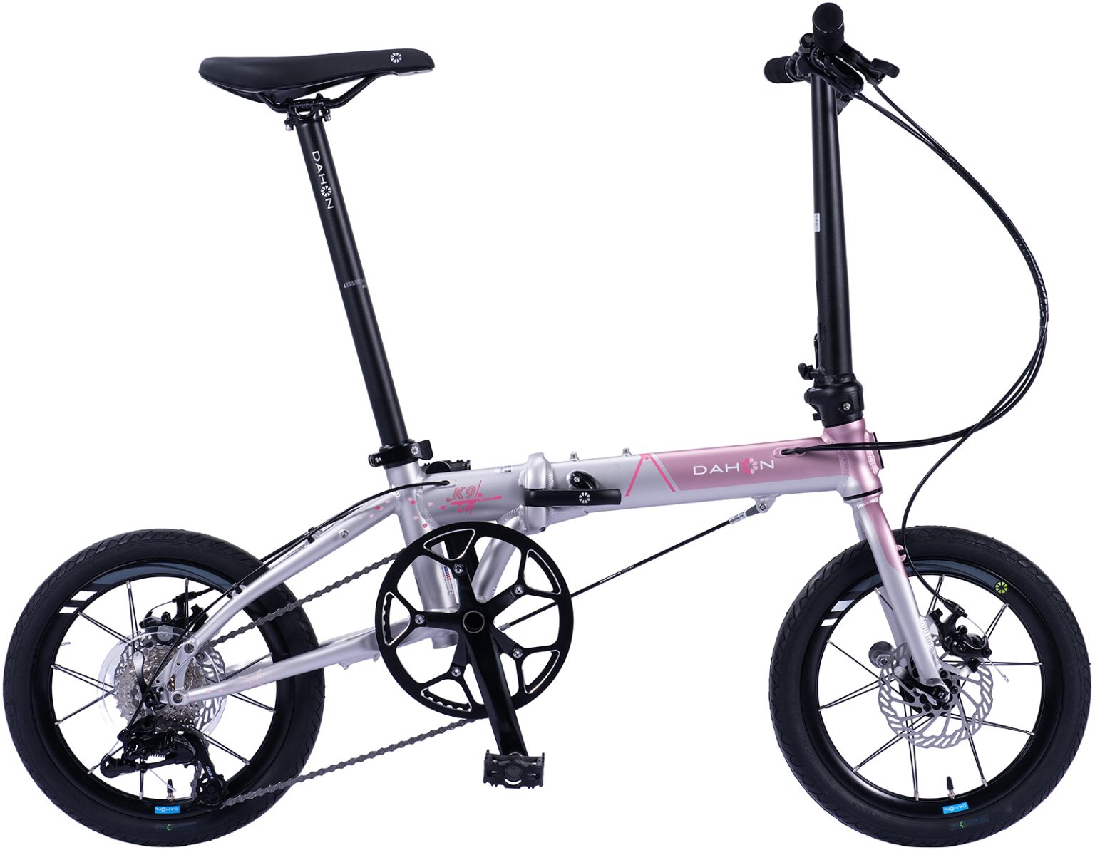 今年はフレームのベースカラーにシルバーを採用し、そこに3数種の異なるピンクを組み合わせることで、より柔らかく上品な印象のカラーに仕上げています。また、DAHONロゴの「O」を花弁に見立てたグラフィックや、モデル名ロゴを彩るフローラルモチーフをプラスし、より特別感のある限定デザインへと進化しました。