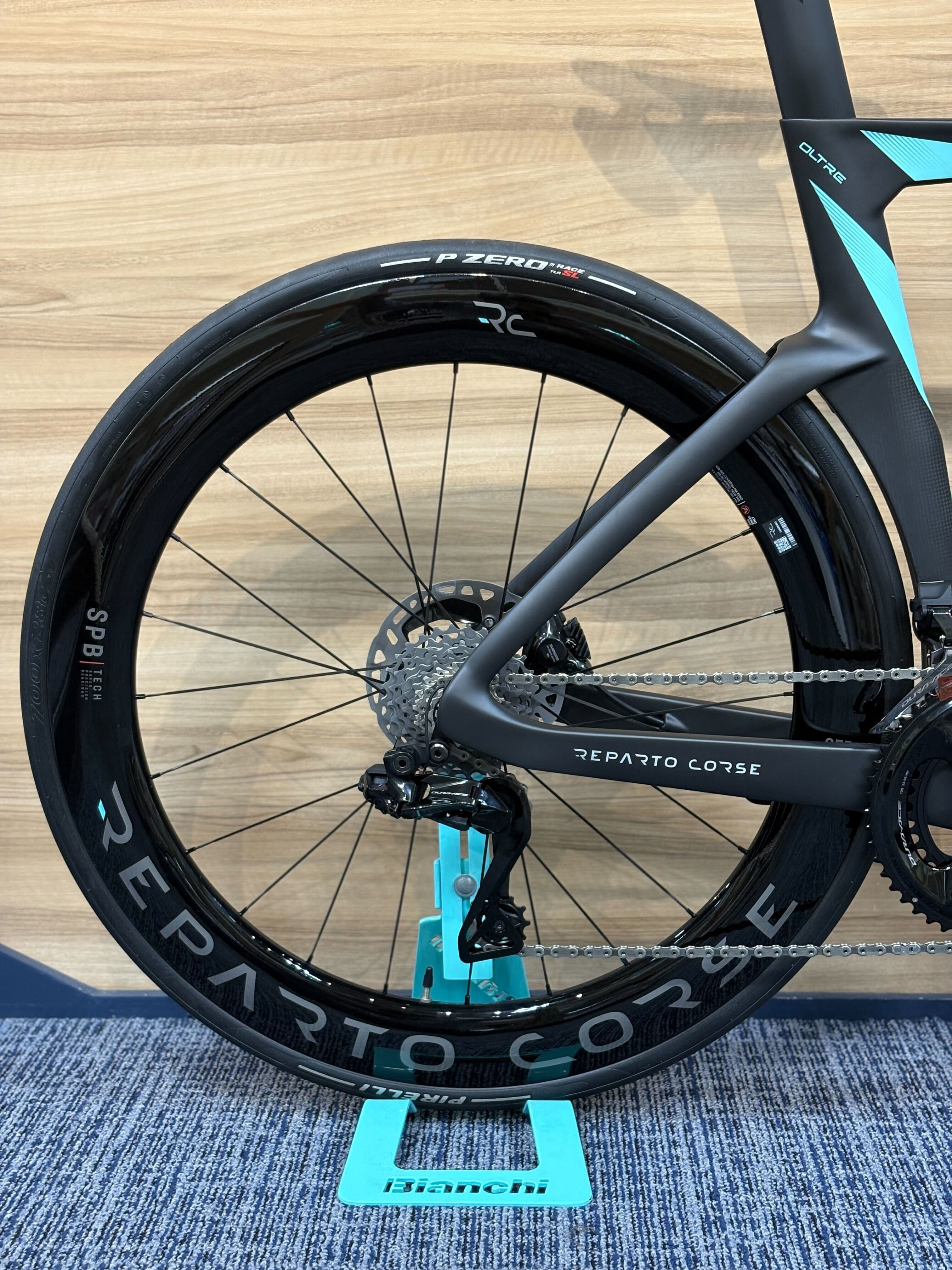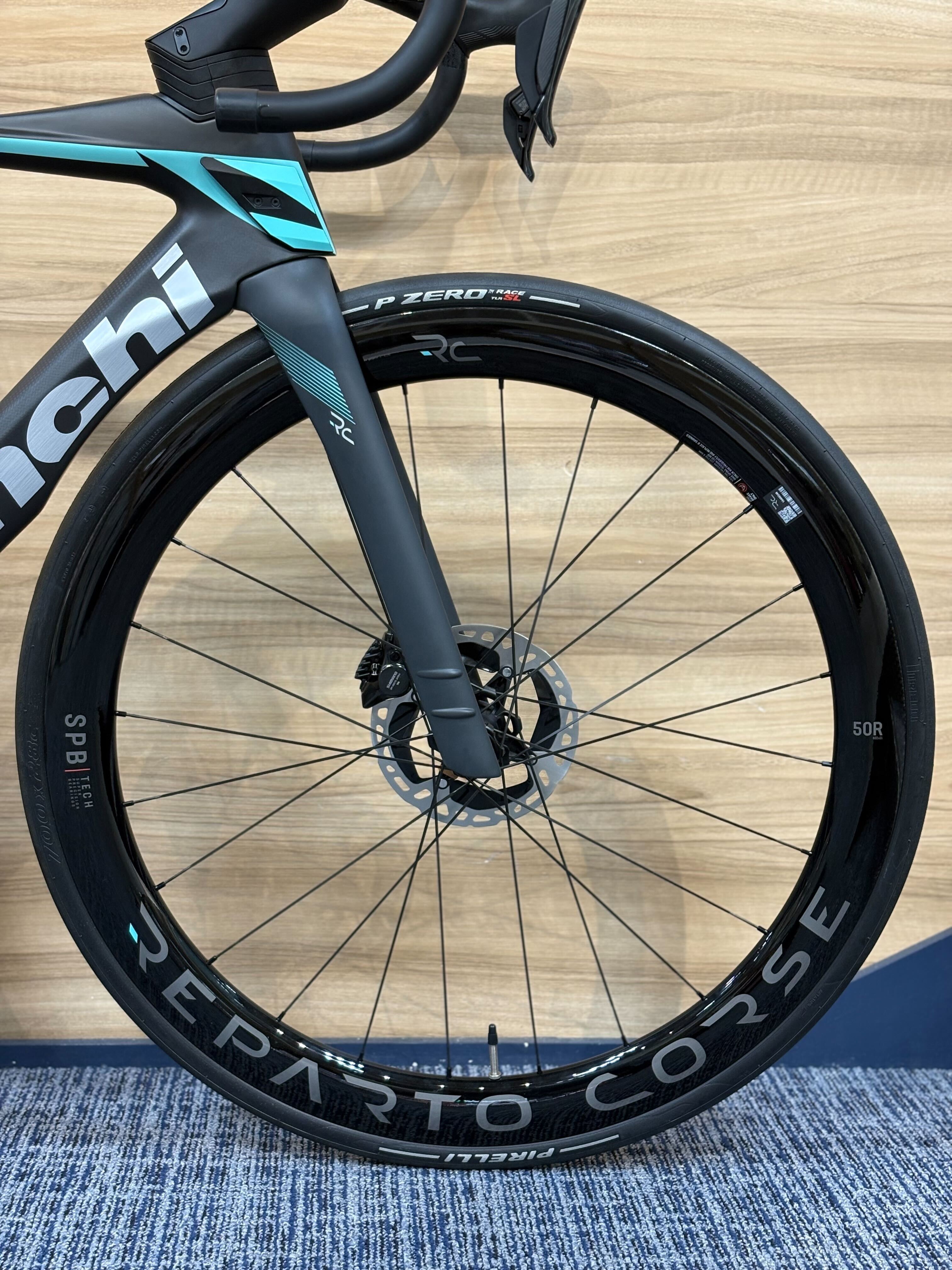 ホイールはRC(レパルトコルサ) チューブレスレディーカーボンホイールセット(フロント50mm/リア65mm)を履いています。