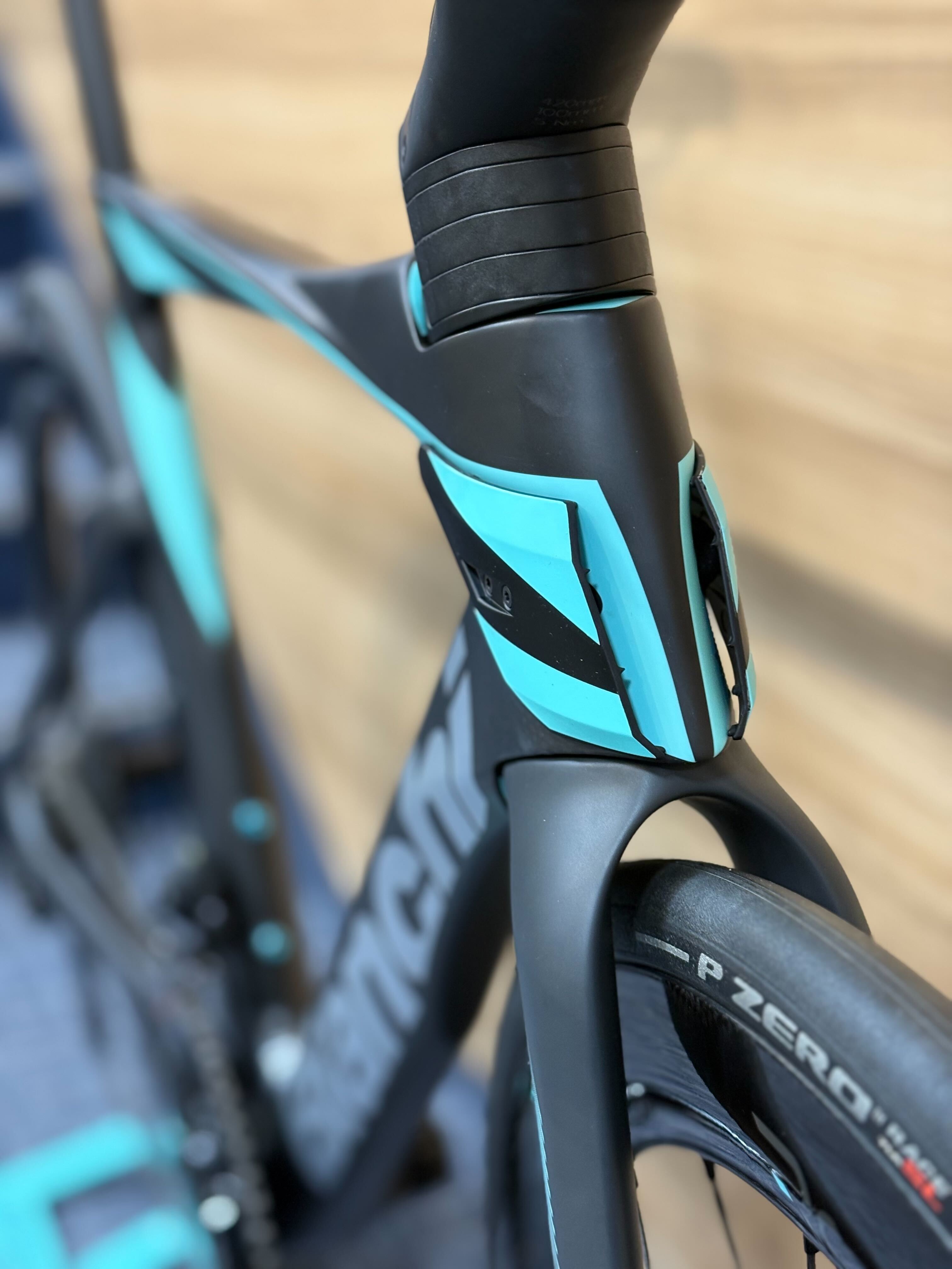 完成車重量は約6.5kgと見た目では考えられない超軽量で、加速性能も非常に良いです。BIANCHIといえば、CV(カウンターヴェイル)をイメージする方も多いと思いますが、このモデルはカウンターヴェイルは非搭載です。その分フレームを非常に軽く仕上げているんのではないでしょうか。