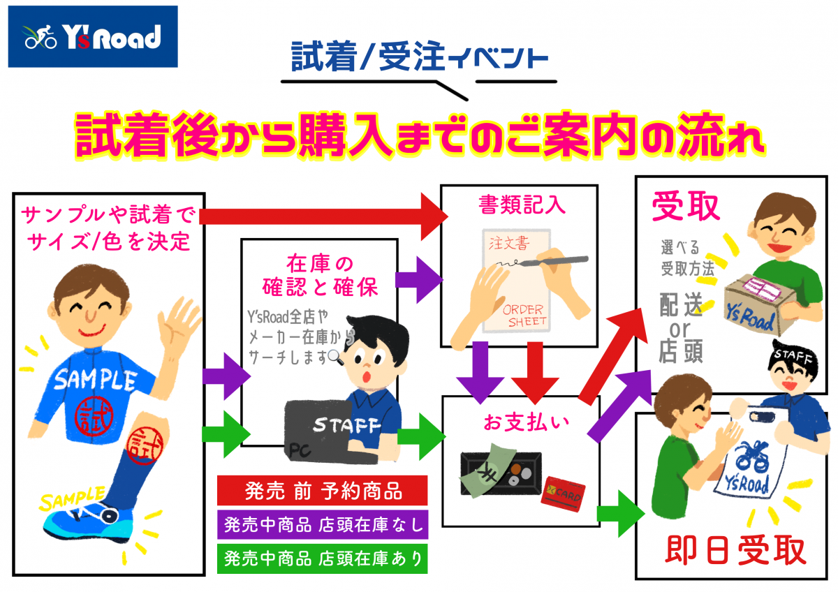 メーカーさんより当日即販売可能のシューズもご用意いただけますが、持ち込みがない場合はお取り寄せでの対応となります。