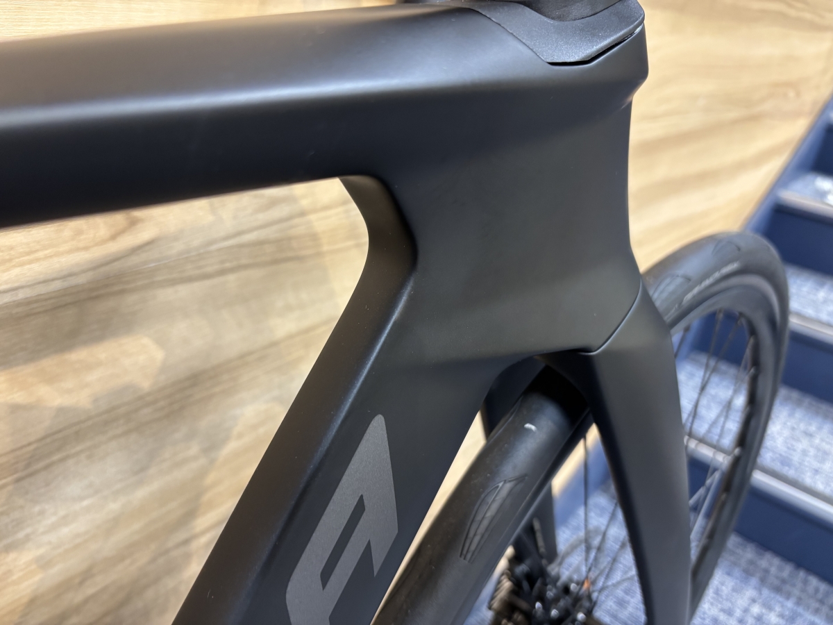 写真でも伝わっていますでしょうか、このオーラ。カラーこそ落ち着いたマットブラックですがまるで戦闘機の様に存在感のある1台に仕上がっていますね!このREACTOで平坦を駆け抜ける姿は月並みですが地上の戦闘機といったところでしょうか。