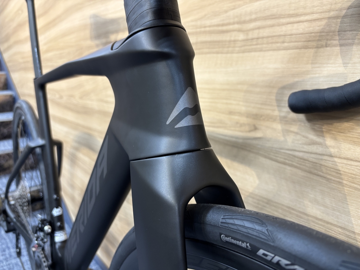 国内未展開の仕様が大記録を達成しているという新型REACTO。そちらはまた詳細をご紹介する記事でお話しできたらと思います。しかし空力性能が優れているのは写真からでも感じられるのではないでしょうか。さらに薄く設計されたヘッドチューブ、太いフロントフォーク、前面投影面積をそぎ落としたフレーム設計からはMERIDAの本気が見え隠れしますね!