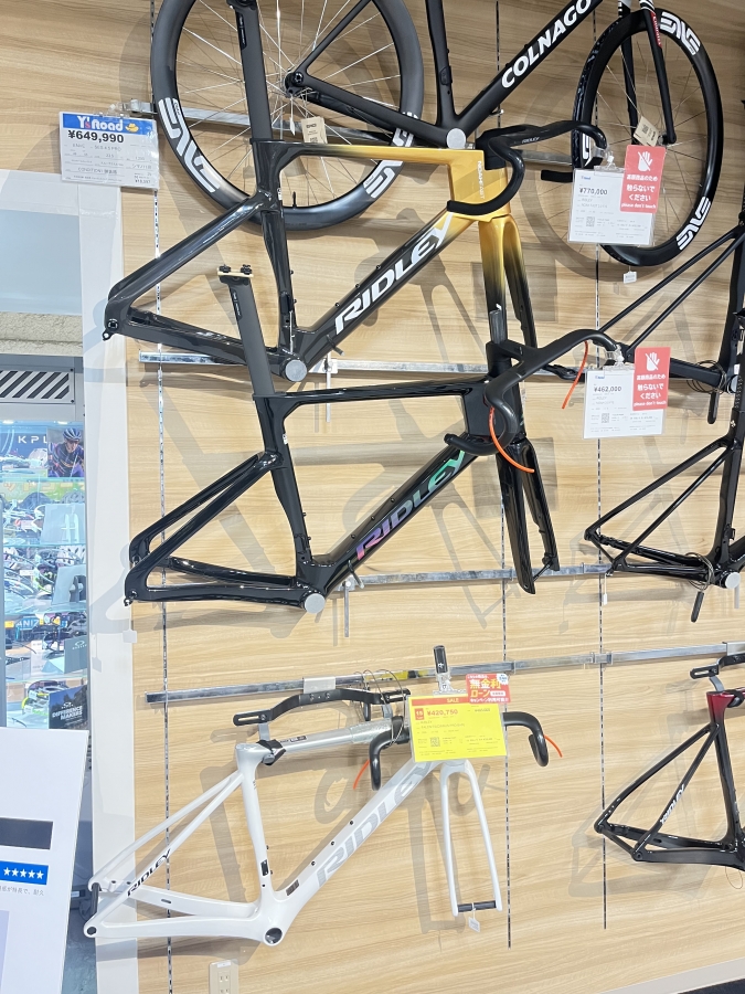 RIDLEYのバイクはフレームセットが多く、自分好みのパーツ構成にして組み合わせやすいことが特長です。神戸店でも、本日までRIDLEYの試乗会をしており好評いただき、FALCNの他、FALCN RS、NOAH FAST 3.0、NOAH 3.0などRIDLEYのロードバイクが勢揃いの試乗会でした。神戸店では、フレームセットでFALCN、HELIUM DISC、NOAH FAST3.0、NOAH3.0がございます。