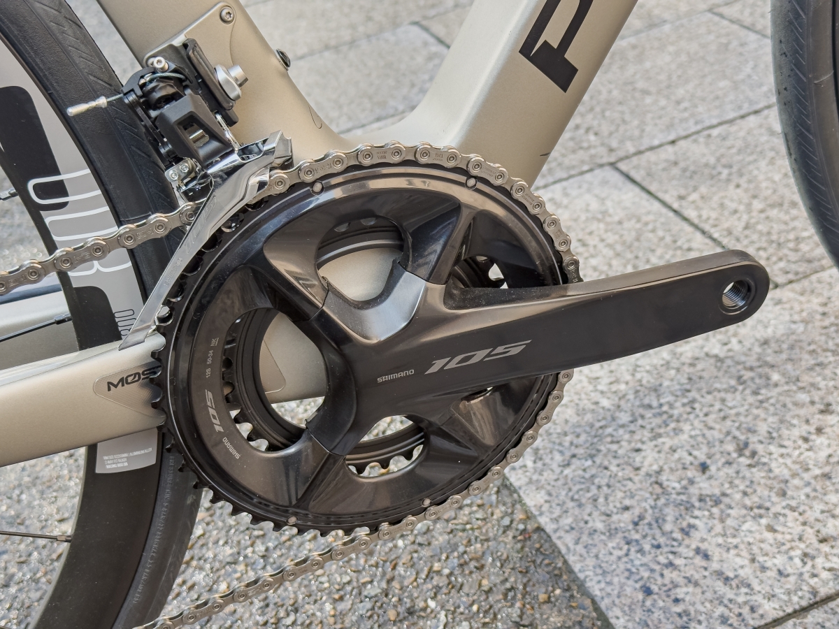 クランクは105の12sモデルが使われていてギアは50-34が付いてますのでヒルクライムでも全然走れちゃいますね!