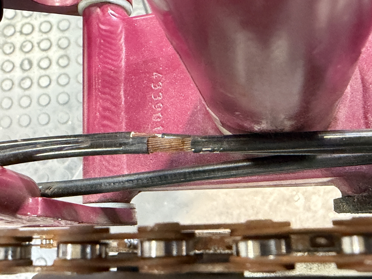 アウターケーブルは頑丈な作りをしているのですが紫外線のダメージや経年劣化などで黒いカバーが外れてしまうことがあり中身が錆びてしまって断線することも