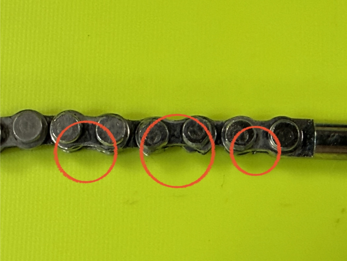 錆が広まってしまうとチェーンに抵抗が出て摩耗によりチェーンの伸びてしまい、チェーンリングなどの歯飛びの原因になったり