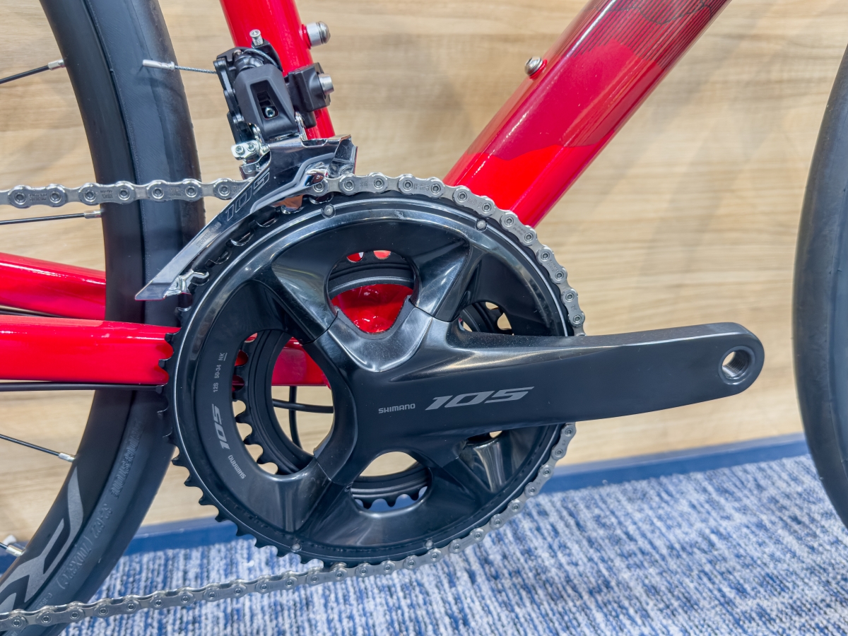 12Sモデルの機械式105が搭載されておりフロントは50-34T、リアは11-34Tが付いてるので平坦からヒルクライムへもどこでも走れちゃいますね!どこでも行けちゃうのでいろんな山岳へもチャレンジしてみて下さい!!