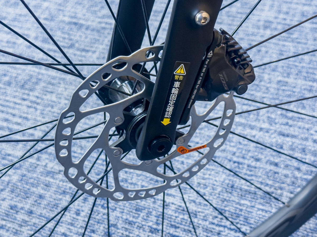 ブレーキももちろん105を採用しているため、急な下り坂や急制動、雨天時でもしっかり止まることができるのでどんなシチュエーションでも安心して使っていただけます。油圧ブレーキなので握力に自信がない女性の方でも安全に使うことができます。