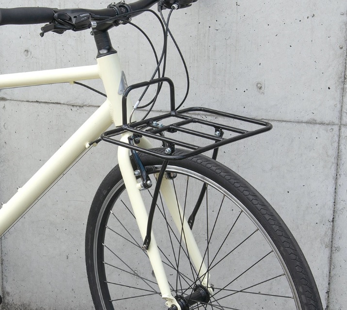 ネジ穴はあるけどカゴはカッコ悪いから付けたくない!という方にはフロントに付ける荷台があります。載せた荷物を固定するバンドが必要だったりと手間にはなりますが、見た目はカゴよりもスッキリします。