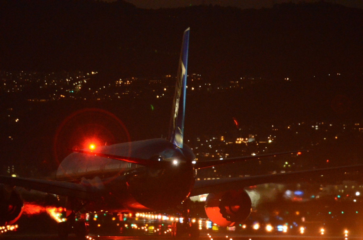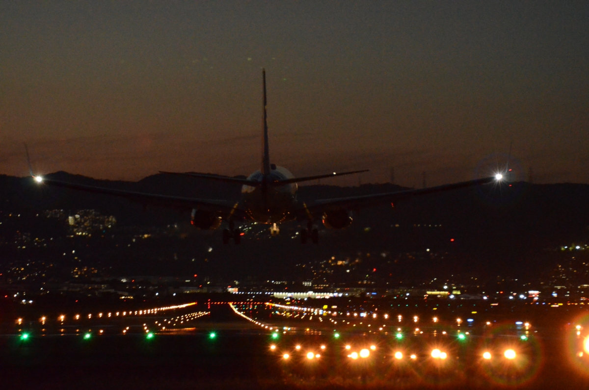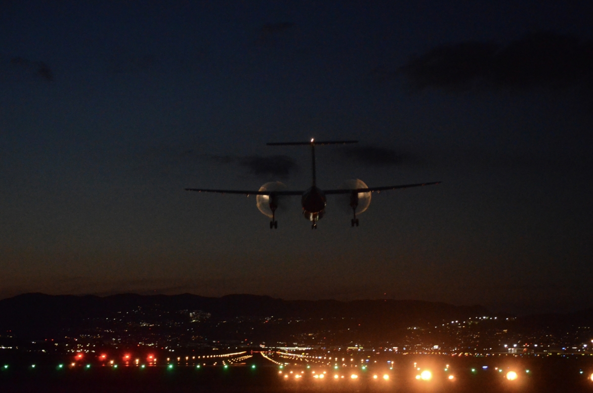 これです。この景色を見にきたのです。滑走路のライトは視界が悪い場合や日没から日の出まで点灯しています。だいたいライトが光り始めてからほんの数分が景色のピークだと勝手に思っています。これは9/26の18:26に撮影したものです。季節によって日没時間が異なるので注意したいところです。