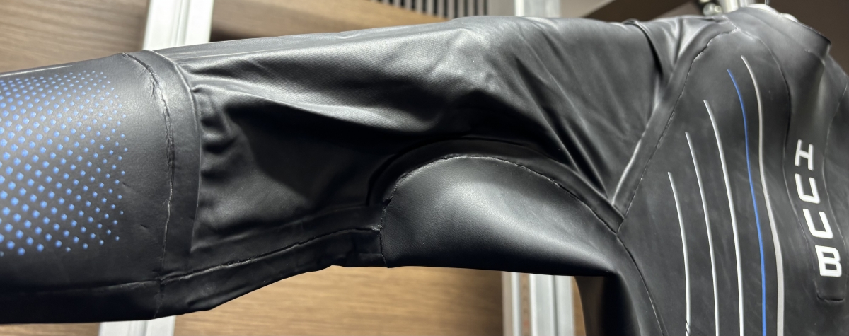 また、スイム中の腕にかかる水の重さを軽減することに重点を置いており、スイムディスタンスにおいて腕の回転時の重量を大幅に軽減してくれます。写真で伝わりますでしょうか、この薄さ。エントリーグレードから比べると体感半分くらいの厚みになっております。これは肩が動かしやすそう!