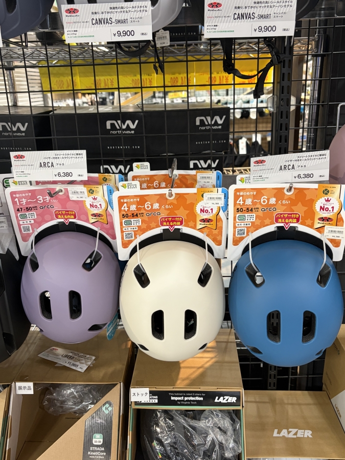 今回の試乗会では、OGK KABUTOの子供用ヘルメットを貸出いたします。年齢別にモデルが分けられていて、サイズのご確認ができ、実際に自転車を試乗する際もお使いいただけます。