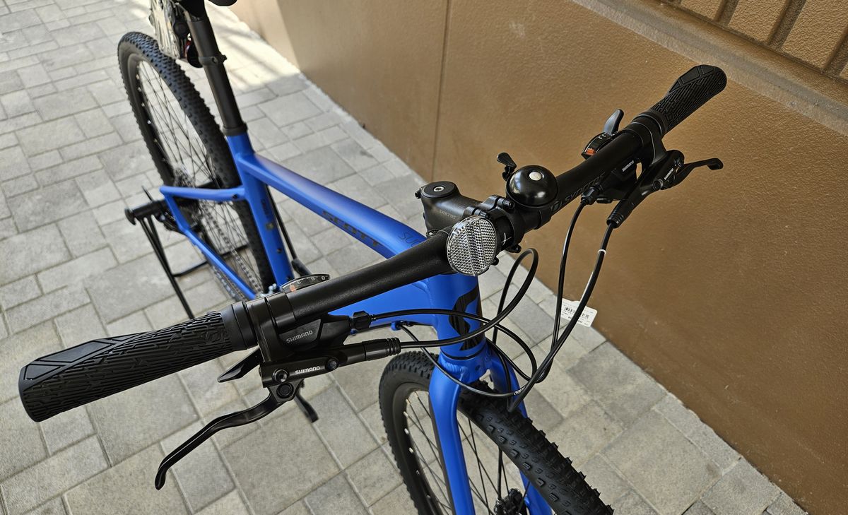 「MTBっぽい」はここにもかかりますが、クロスバイクの中ではちょっと長めの660mm幅のハンドルを採用しています(グリップ込みの実測だと680mm近くあります)。