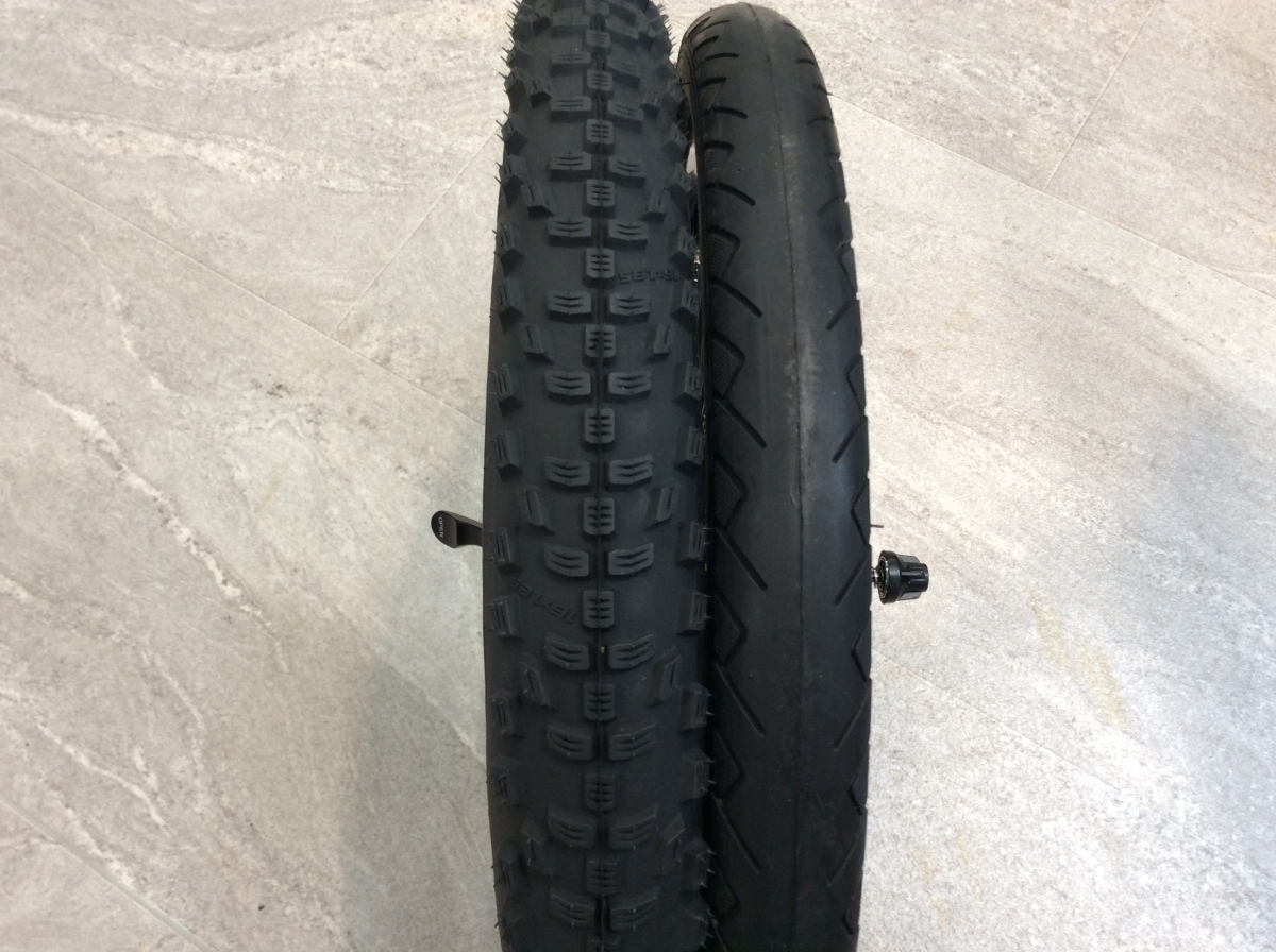 左側がSCHWALBE SMART SAM、右側がK9X純正タイヤとなります。