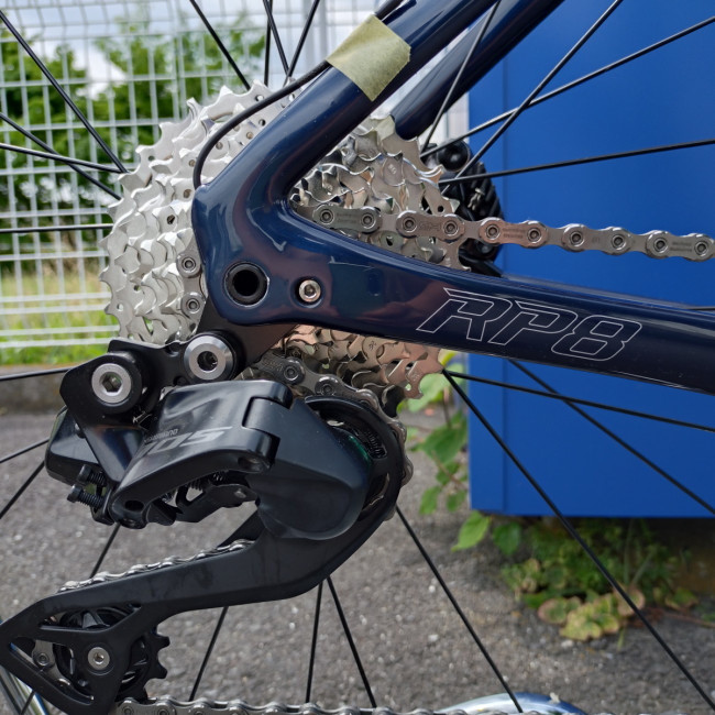 フラッグシップモデル『RP9』をベースにオールラウンドなレースバイクを手掛けるにあたり重視したのが、空力・剛性・重量の3要素を高い次元でバランスさせることです。カーボン素材のグレードを見直したモデルになっており主要な部位の剛性はRP9対比で約90%としつつ、走行フィーリングを左右する剛性バランスはRP9同等に設定したことで、RP9譲りの乗り味を維持しています。フレーム形状はRP9と同一形状のため空力特性は同等を維持しており、レーシングバイクとしての性能を確保しています。