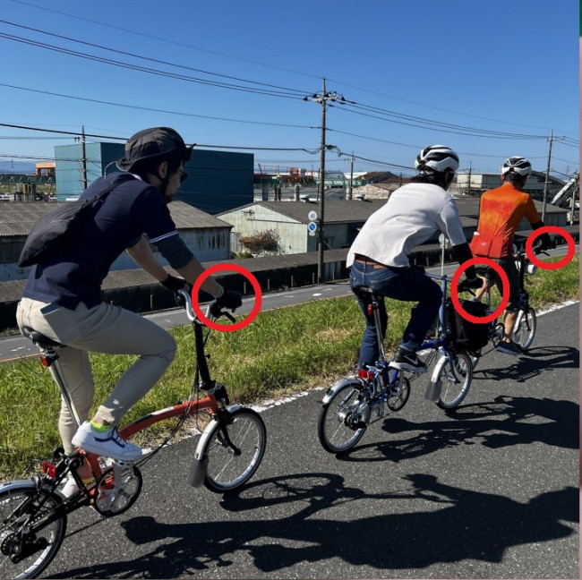 何時ぞやのBROMPTONスタッフライドでも私服ながらヘルメットとグローブは皆しっかり着けています。