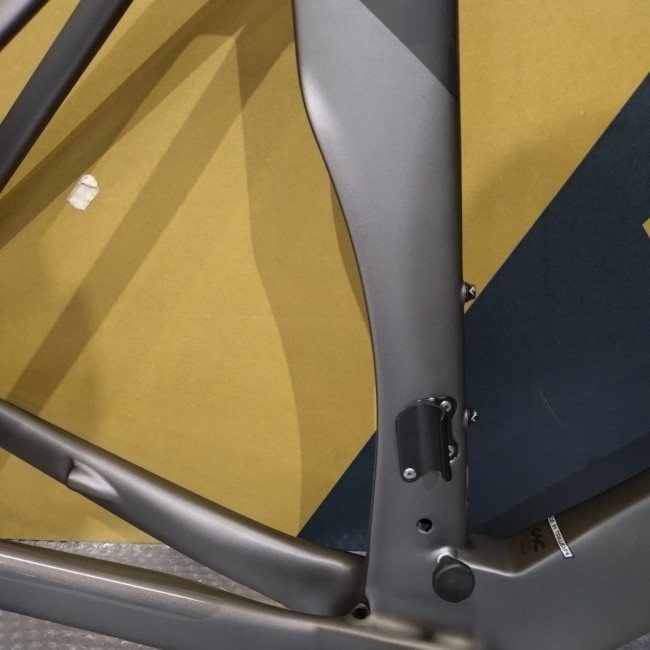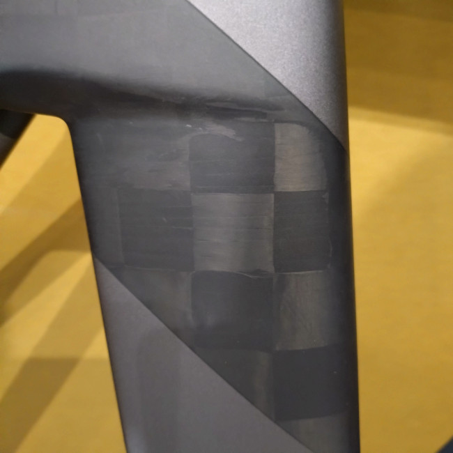 ダウンチューブは前方と後方で大胆に形を変えています。前方では左右方向に厚く、前後方向に狭い。後方ではその逆として、ライダーを含めた全体での空気抵抗の最適化を図っています。