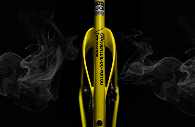 まるで戦闘機のノーズを思わせる、鋭く設計されたヘッドチューブ。