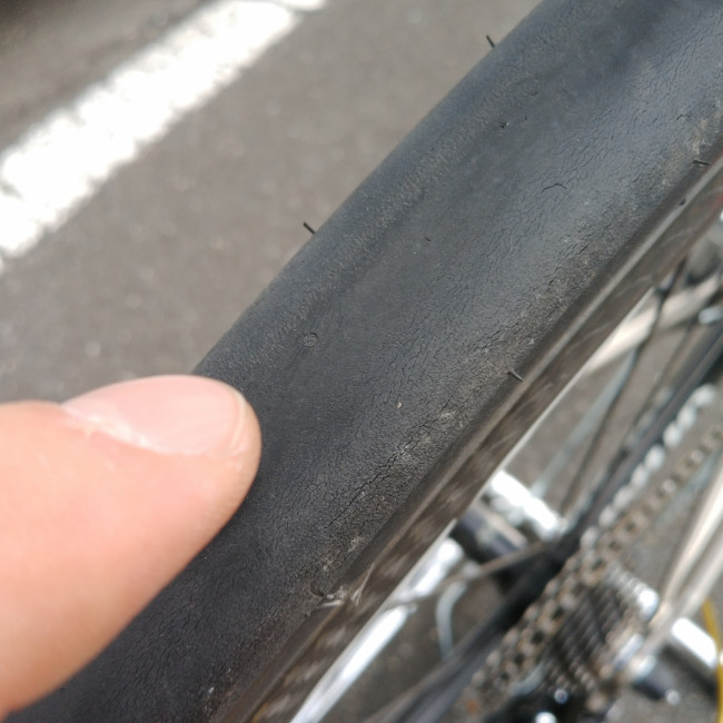 フロントタイヤに比べて明らかに磨耗・劣化が進んでいます。全く同じ日にタイヤを取り付けましたがリアの方が体重がかかるので磨耗が早くなります。