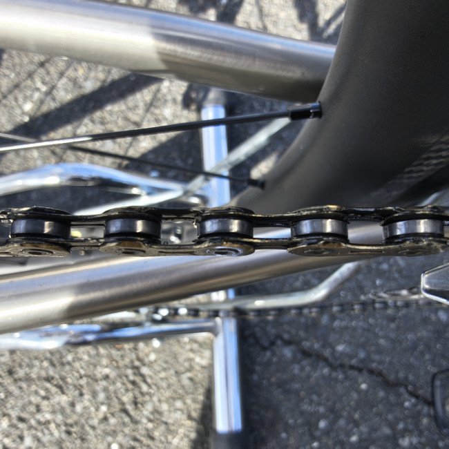 強いてデメリットをあげるとすればオイル成分が主成分なのでチェーンは汚れやすいです(画像のチェーンは一回汚れを拭き取ってます)