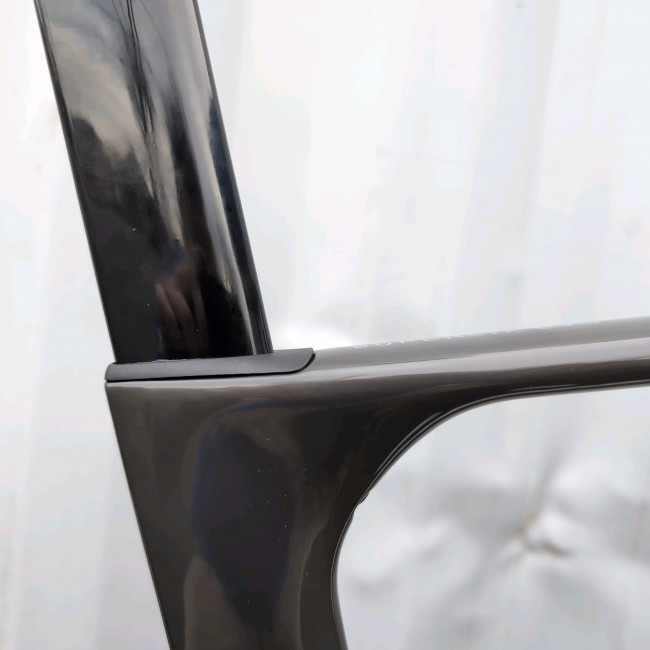 まず、変わった点はジオメトリーです。スタックハイト(BBからヘッドチューブまでの垂直上の長さ)が10㎜短くなりました。これによりハンドル位置を低くすることができ、よりレーシングなポジションを取ることが出来ます。「速さ」を求める方には嬉しい結果となりましたが、ゆったりとしたポジションを求める方には、やや乗りにくい印象になったかもしれません。