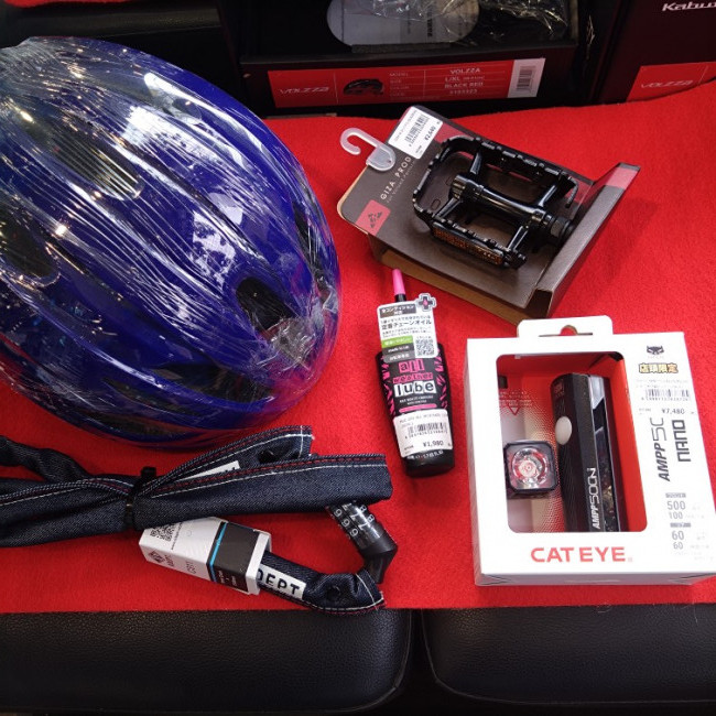 (前後ライト、鍵、ペダル、ヘルメット、チェーンオイルですね)