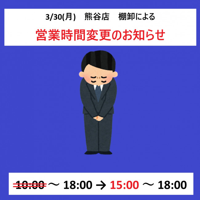 3/30(月)の棚卸による営業時間の変更をお伝えします。