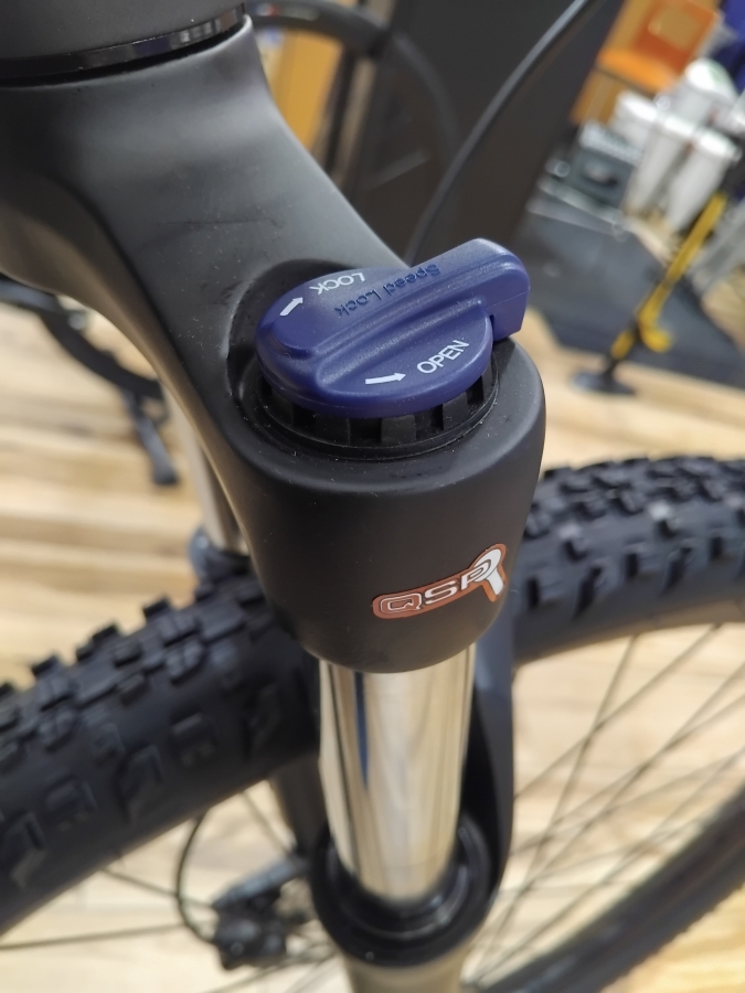 サスペンションロックアウト機能を使うと、一時的にサスペンションがロックされフロントフォークが沈まなくなります。