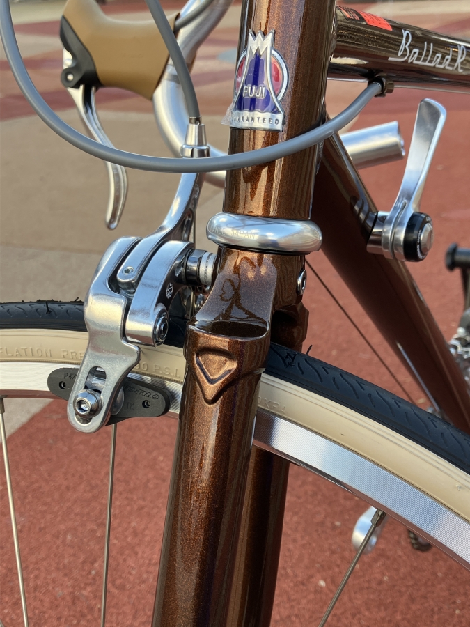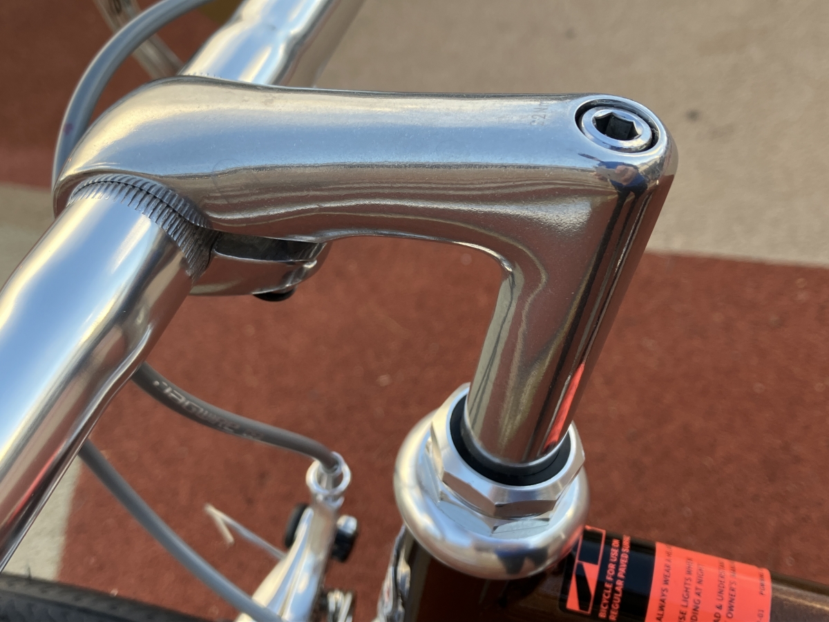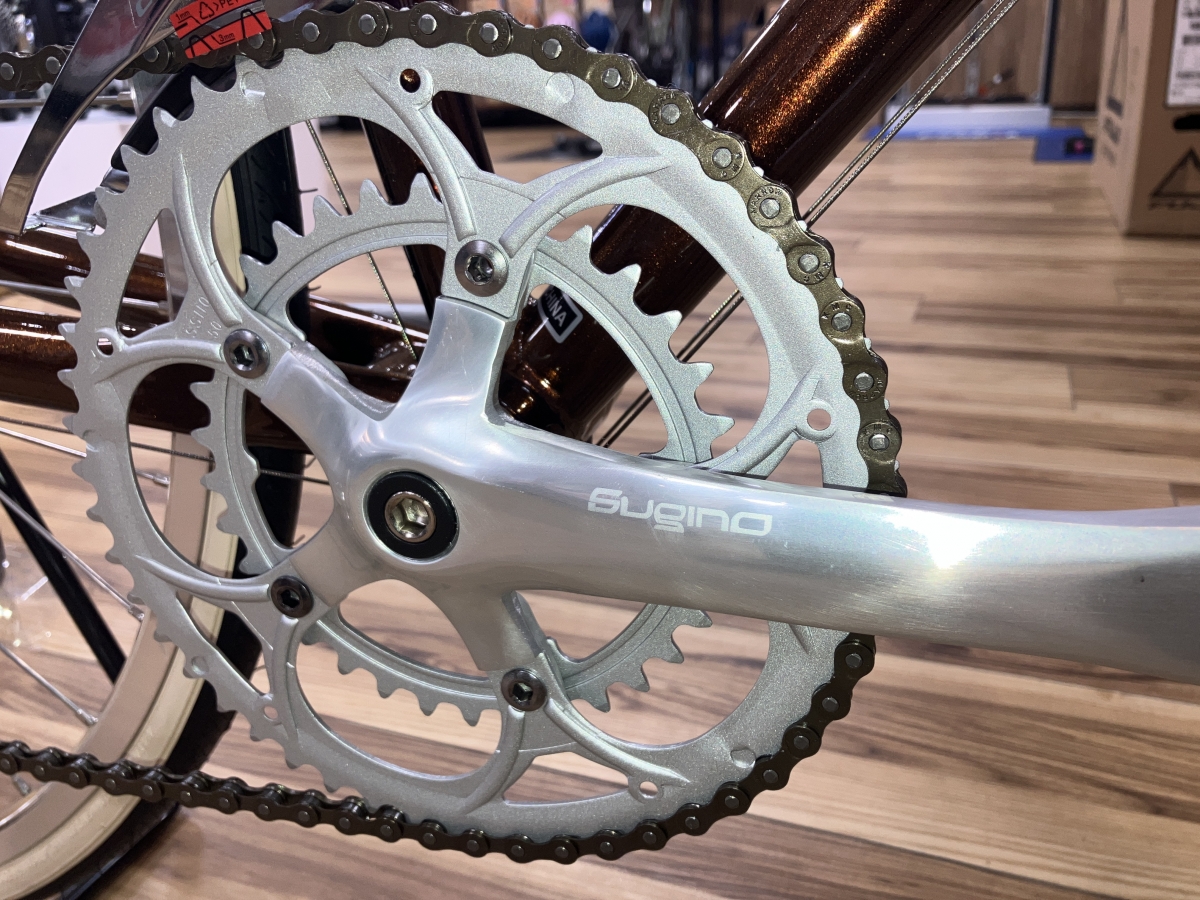 クランク部分は自転車の印象に大きく影響します、ここがシルバーですとグッとクラシカルな雰囲気に近づきます。しかも国内メーカーのスギノ製!歯数は50-34Tと現代的な歯数になっており登りでも楽にこなせるようになっています。