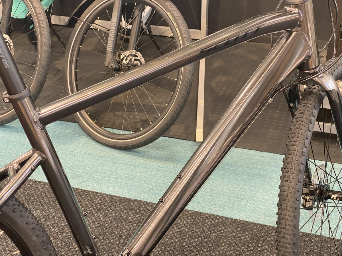 緩やかなスローピング形状と長めのヘッドチューブ。