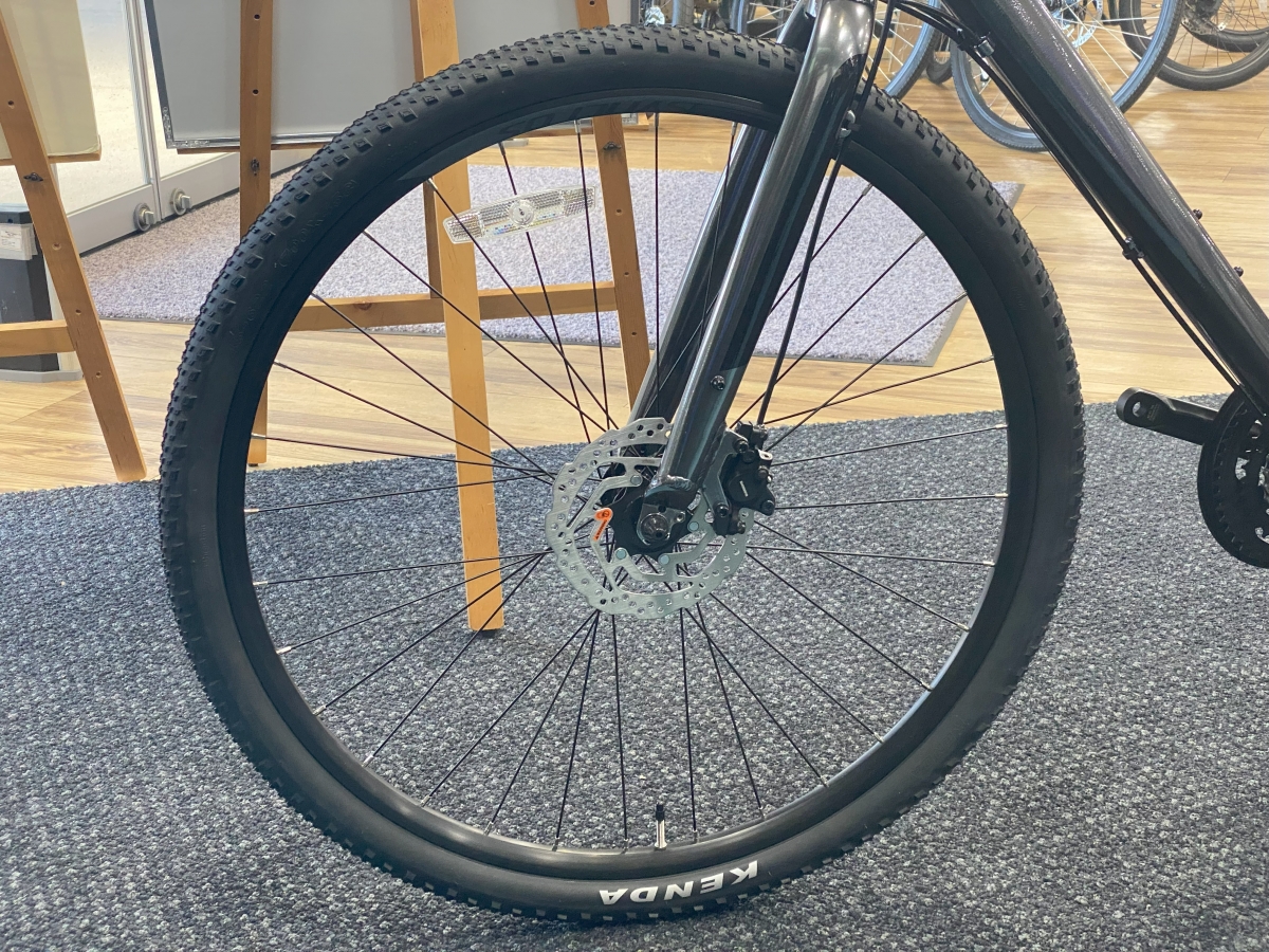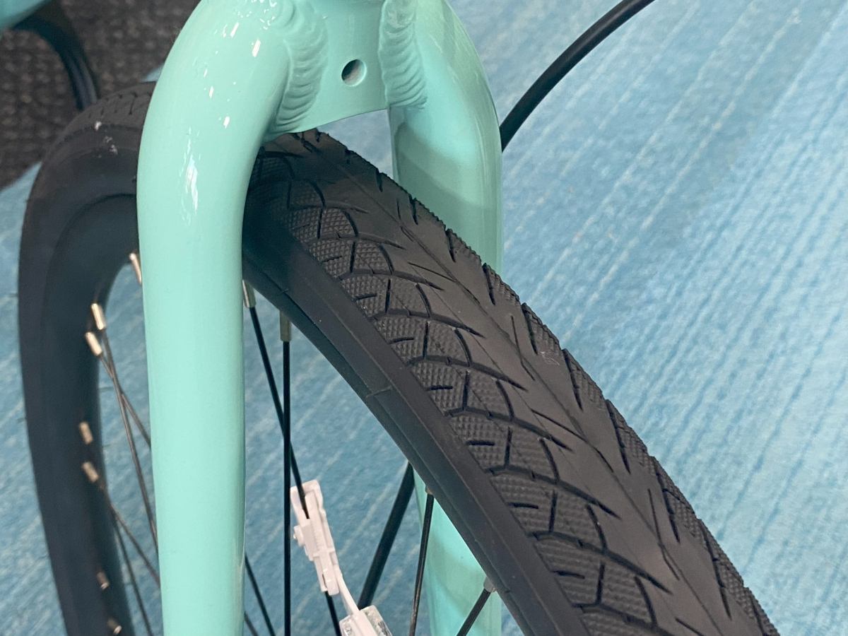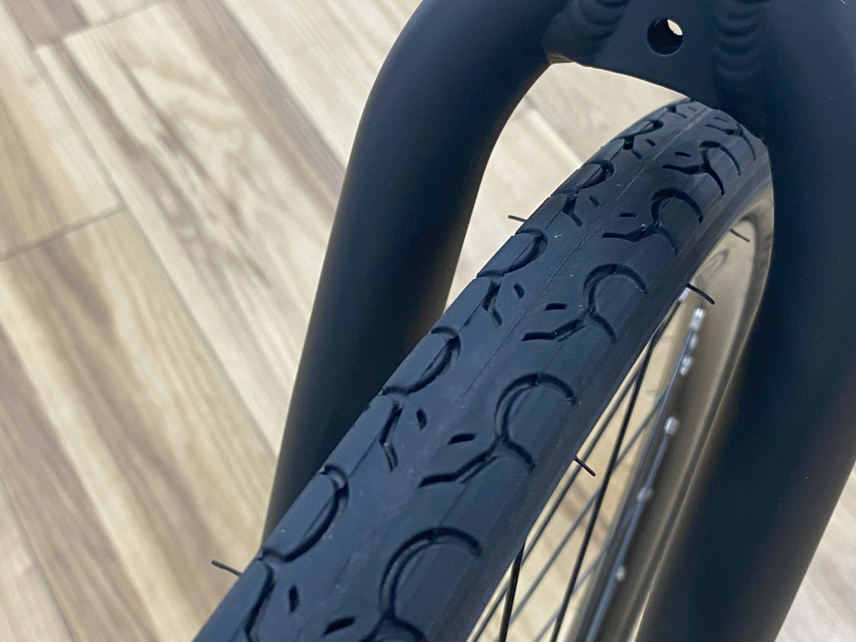 見た目マウンテンバイクかと思わせるような太目のブロックタイヤ。