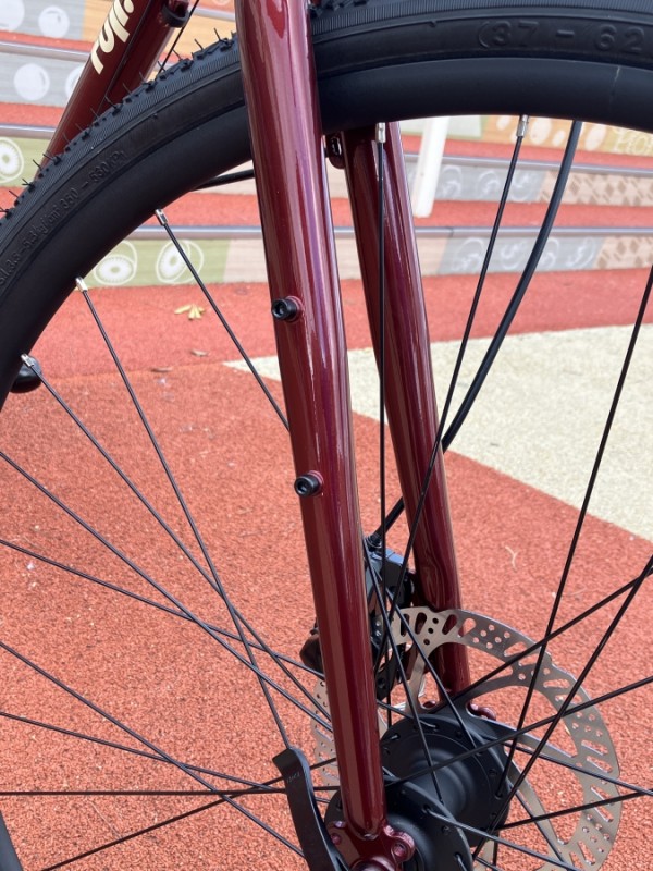 しっかりとしたブロックのある幅広35Cタイヤ。エッジの立ったブロックは滑りやすい路面もがっちりグリップしてくれるのでちょっとしたオフロードぐらいならそのまま走れます。