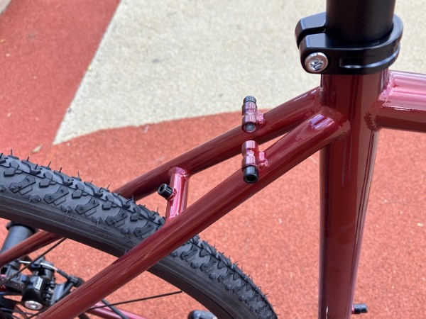 シートチューブにもフェンダーやラック取り付けに使えそうなダボ穴あり!ラックを搭載すれば後ろ側に大きな容量のストレージを造ることができキャンプ泊などにも対応できそうです。