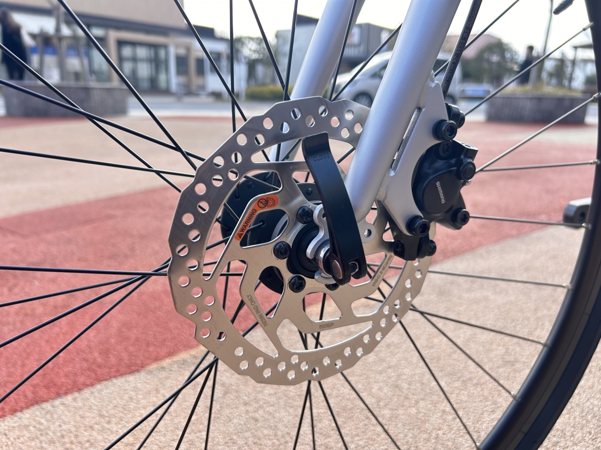 雨天時でも制動力が安定しているのに加えて、機械式ディスクブレーキより引きが軽いです。