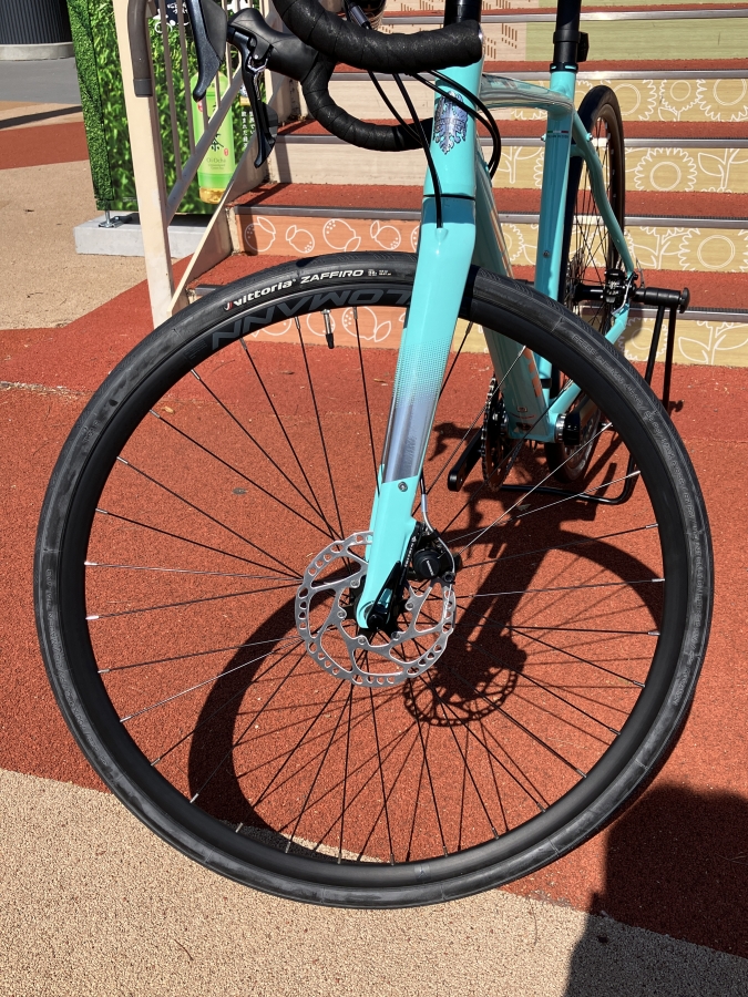 タイヤはロードバイクとしては太めの32Cが最初から付いており高いクッション性とグリップ力を持っています。ロードバイクの悩みの一つにお尻や手の痛みがありますが太めのタイヤは中にたくさんの空気を蓄えることができ、その空気がクッションになる為優れた振動吸収性を発揮します。また太めで幅が広いという事は路面との接地面積も増えるのでグリップ性能も向上します。