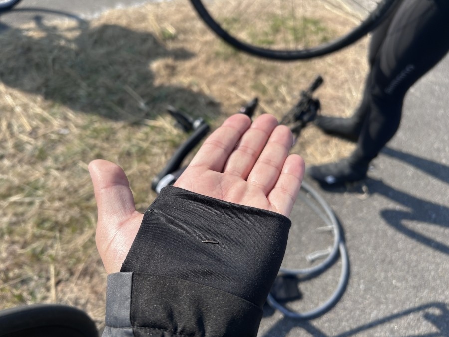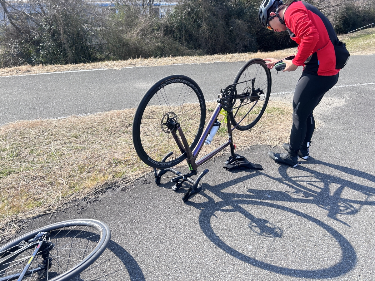 幸い自分のタイヤではなさそうと安堵していると知人の後輪がぺったんこに。