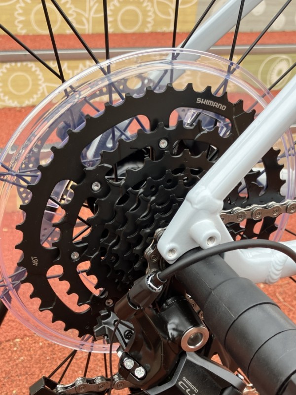 リアの最大ギアは46Tと巨大なギアが付いておりフロント変速がなくともギア比1:1以下の軽いギア比になっており登り坂もバッチリ!将来パーツ交換したくなった際もShimano CUESグループであれば幅広い選択肢の中から選んでいただけます。