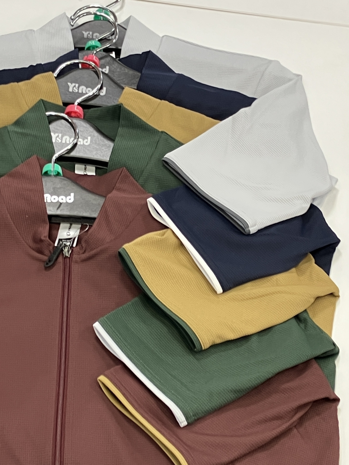 シンプルな無地の半袖ジャージですが袖口にワンポイントでメーカーロゴと同じ差し色が入っています。しかもカラーによって違うオシャレ仕様!アンバー、フォレスト、マルベック辺りは実際に着用すると結構見え方が変わりそうです。