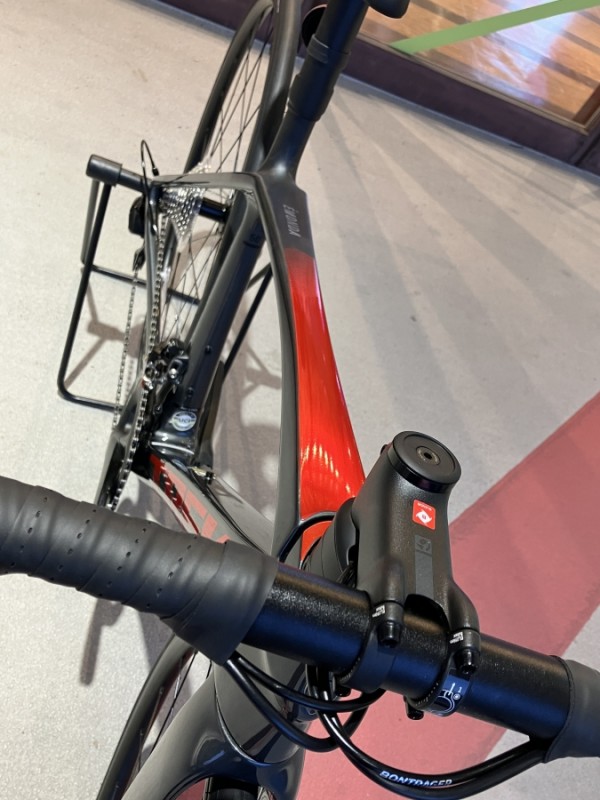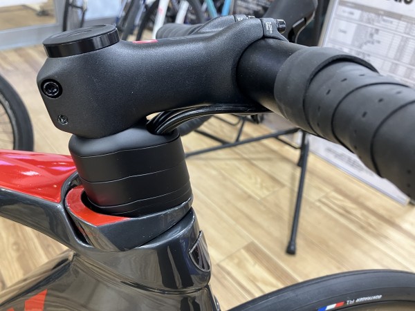 ケーブルの内装はステム下から通ってフレームに入る構造で空力的なメリットとメンテナンスやポジション変更のやりやすさも両立した優れた方式を採用しています。