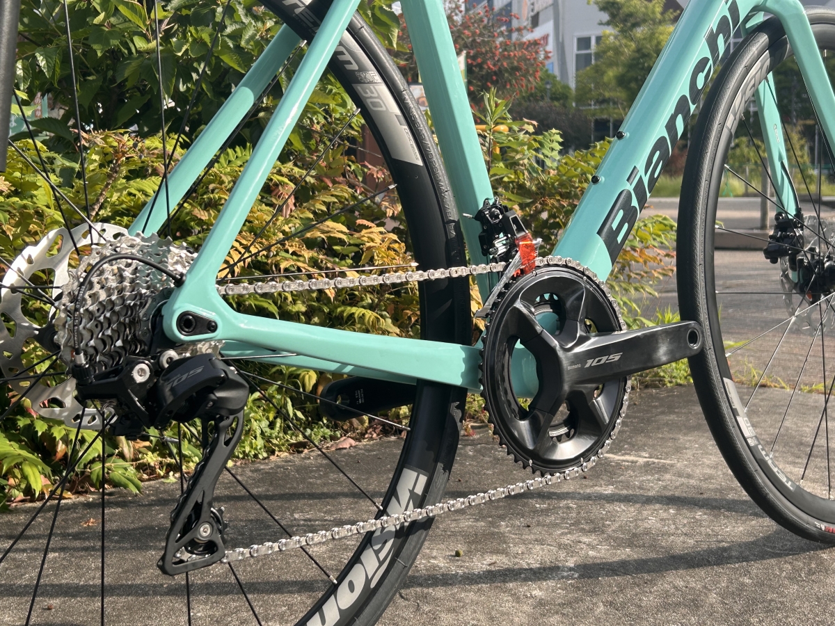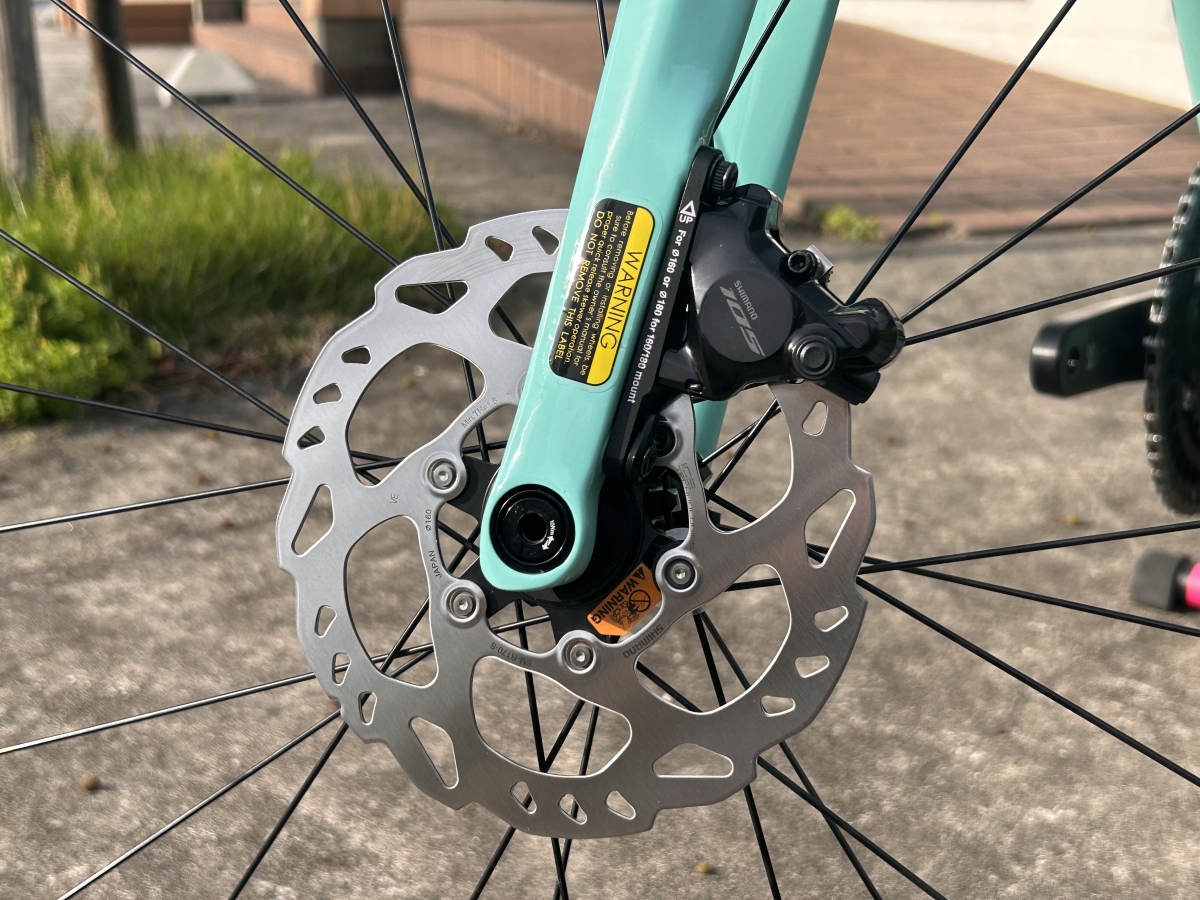 コンポは最新のシマノ105機械式の12速と油圧ディスクブレーキを搭載。