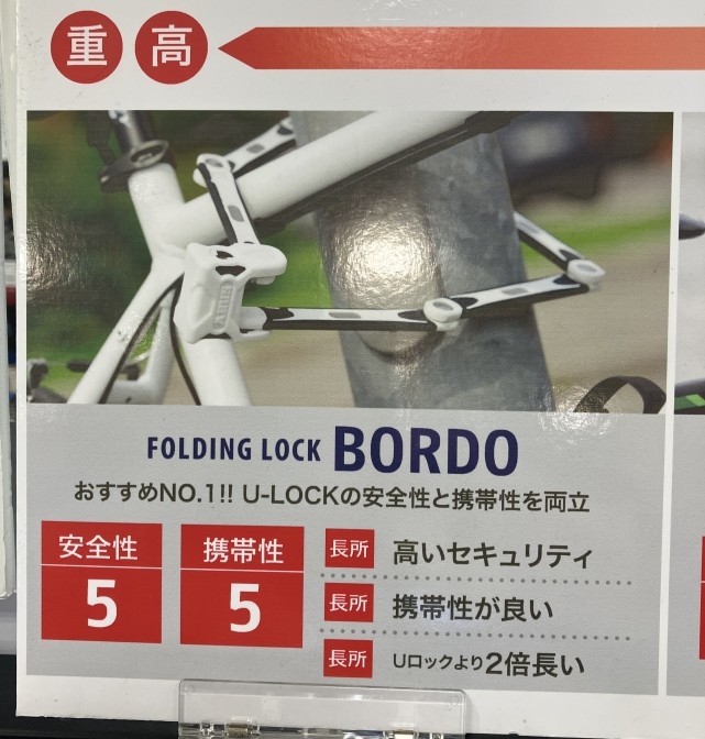 U字ロックのような堅牢さをもちつつ折り畳めるようにすることで携帯性を向上したのがBORDO。専用のホルダーを使えば車体への取り付けも可能で簡単に持ち運びが可能です。