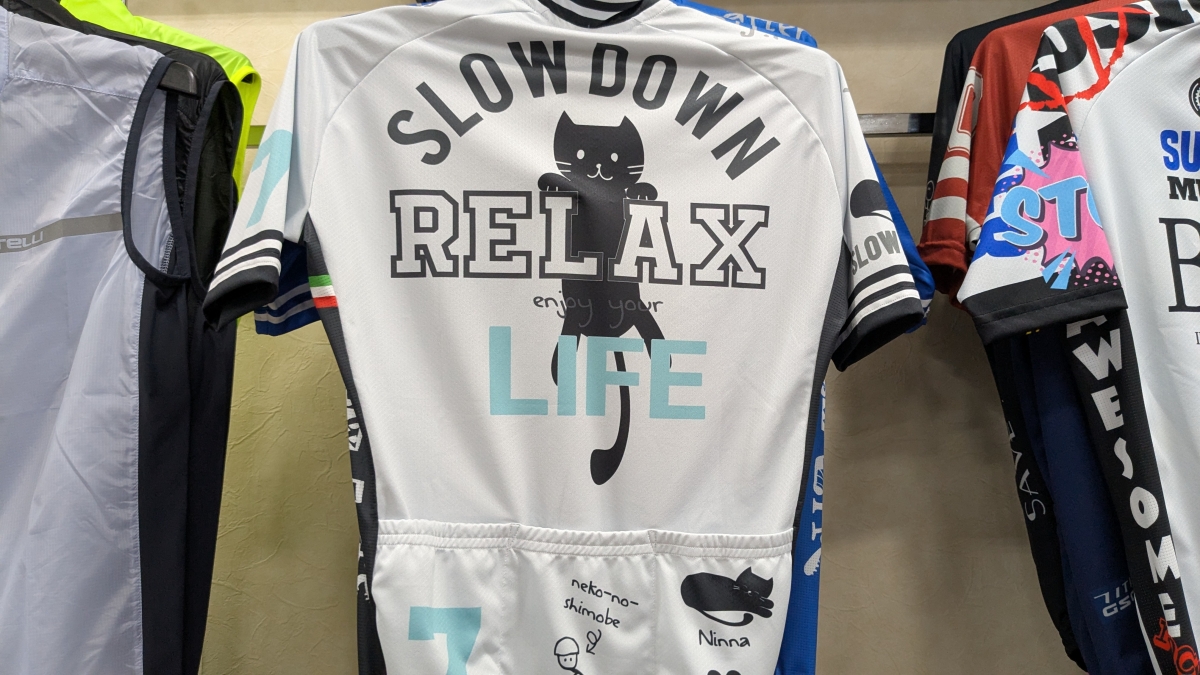 胸元にはキュートな黒猫とRELAX LIFEの文字が!