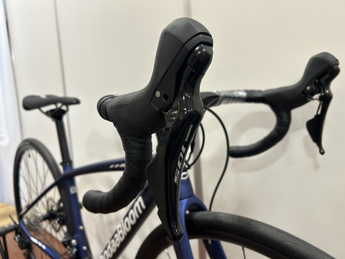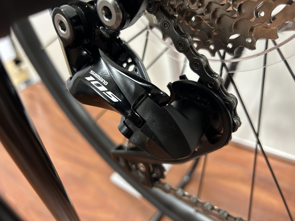 車体の変速機はシマノ105というグレードが付いており、リアの変速段数は11段!今でこそDI2(電動変速機)だったり機械式12速がありますが、105グレードの11速もレースでも使えるくらいしっかりしたものです。そんなコンポーネントが付いて車体価格が20万円台!カスタム性も高いのでお勧めです!