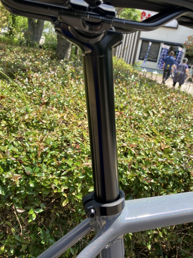 シートポストは(おそらく)あえての丸形汎用規格。この規格はたくさんの商品がありカスタムしやすい優れた規格です。カーボンやアルミ製で軽量なものや振動吸収に優れたものなどご自身に必要な物からカスタム可能です!