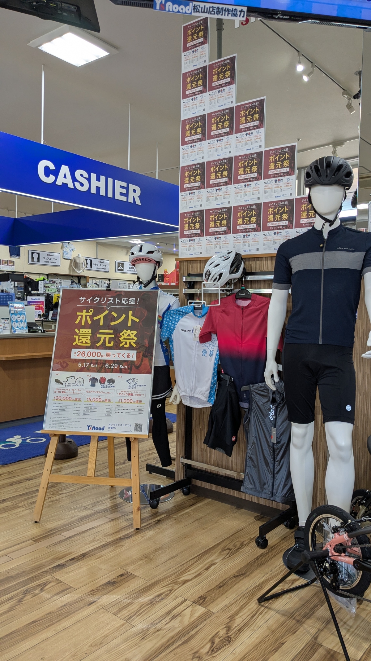ただいまワイズロードではウェア、ヘルメット、シューズなど3点以上まとめてご購入いただくとお値段に応じてポイントを還元させていただく
