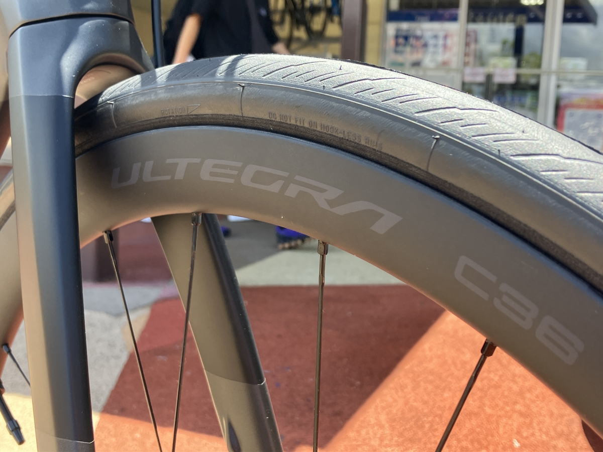 DURAACEホイールと同じリム形状を採用したアルテグラホイールは性能と価格のバランスに優れたベストバイな一品。エンデュランスモデルですが車体付属のタイヤが28Cということもあり内幅21ミリのこちらが好相性ではないでしょうか。今後タイヤ交換する際も軽量な28Cあたりからグリップや振動吸収性重視の32Cまで(フレーム側制限がオフィシャルには32Cまでの対応)幅広く対応可能です。